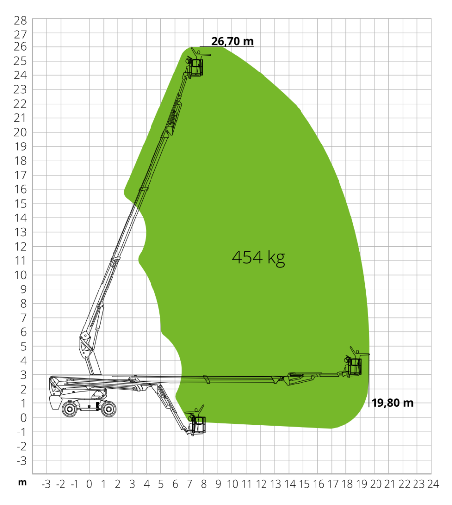 A self-propelled telescopic boom lift, hibrid Aerial Work Platform with a 26.7-meter working height. It can be used indoors and outdoors. Also suitable for off-road use, as it features non-marking, foam-filled off-road wheels, 4x4 (all-wheel drive), 4-wheel steering, and 30% gradeability.